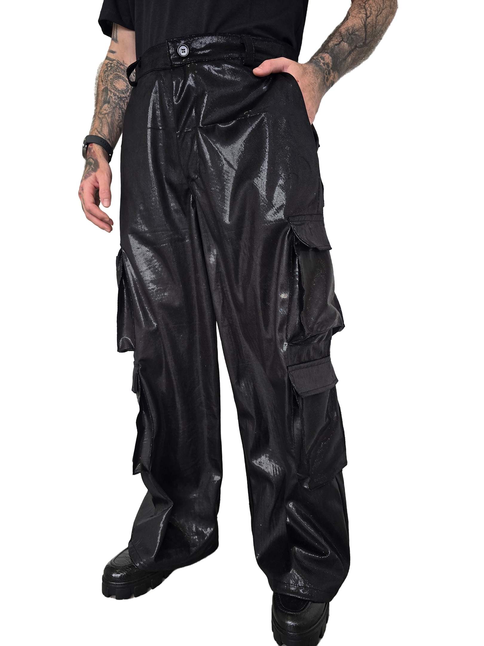 Calça Cargo Preto Futuro preta em material sintético com acabamento brilhoso, que traz um visual moderno e ousado. Possui modelagem ampla e caimento solto, com bolsos utilitários nas laterais que reforçam o estilo streetwear. Ideal para compor looks urbanos e cheios de atitude.