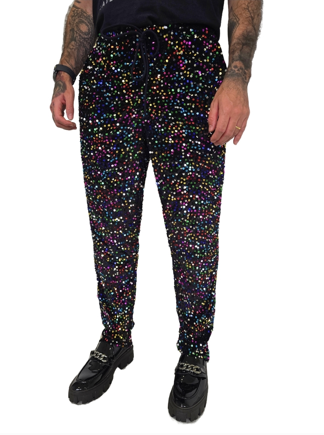 Calça com paetê colorido bordado em cima de tecido de veludo