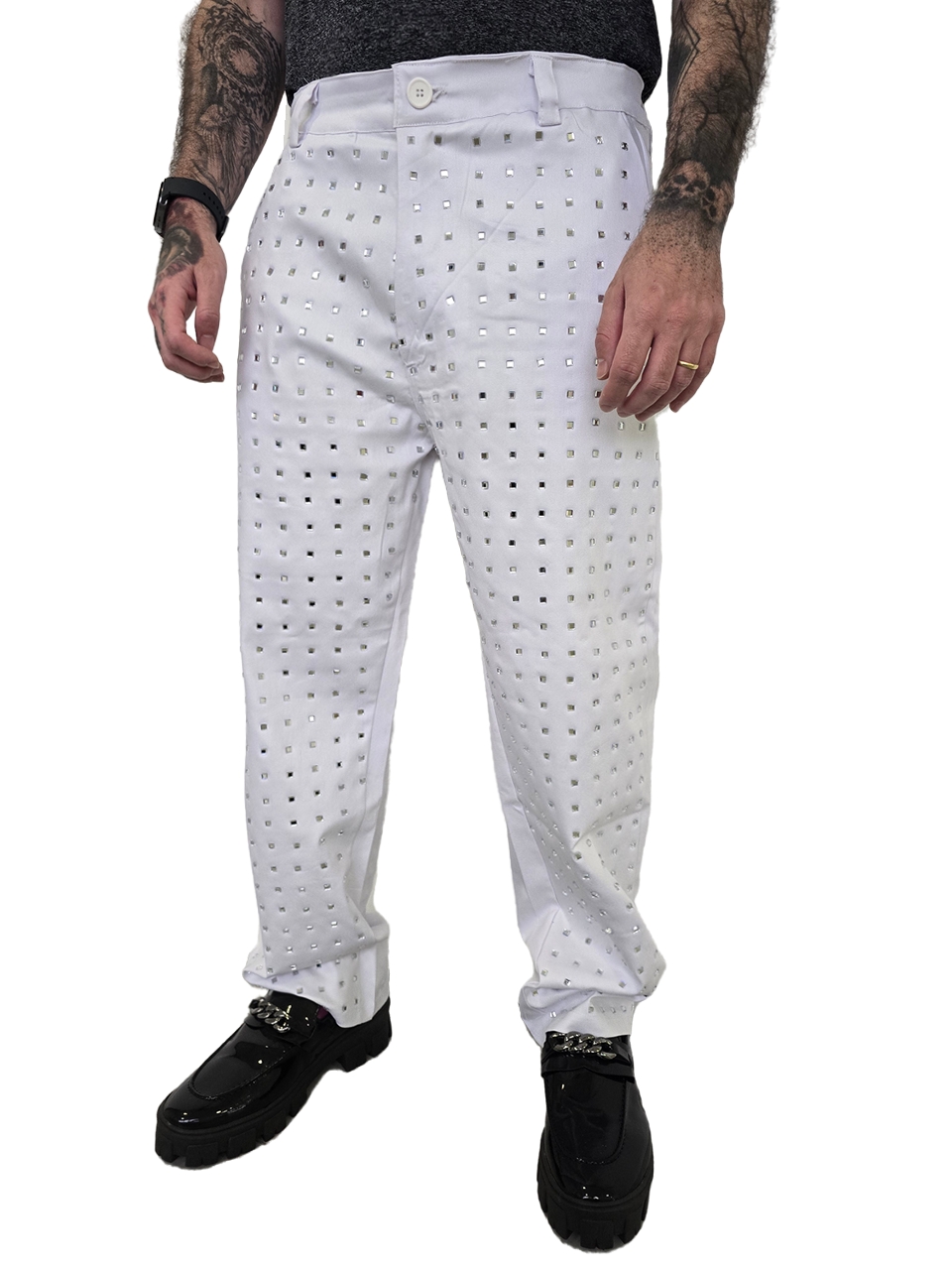 Calça Espelho com design moderno e ousado, confeccionada em tecido estruturado com aplicações de pequenas tachas quadradas, criando um visual texturizado e sofisticado. Ideal para composições estilosas e cheias de personalidade, perfeita para quem gosta de um look marcante e diferenciado.