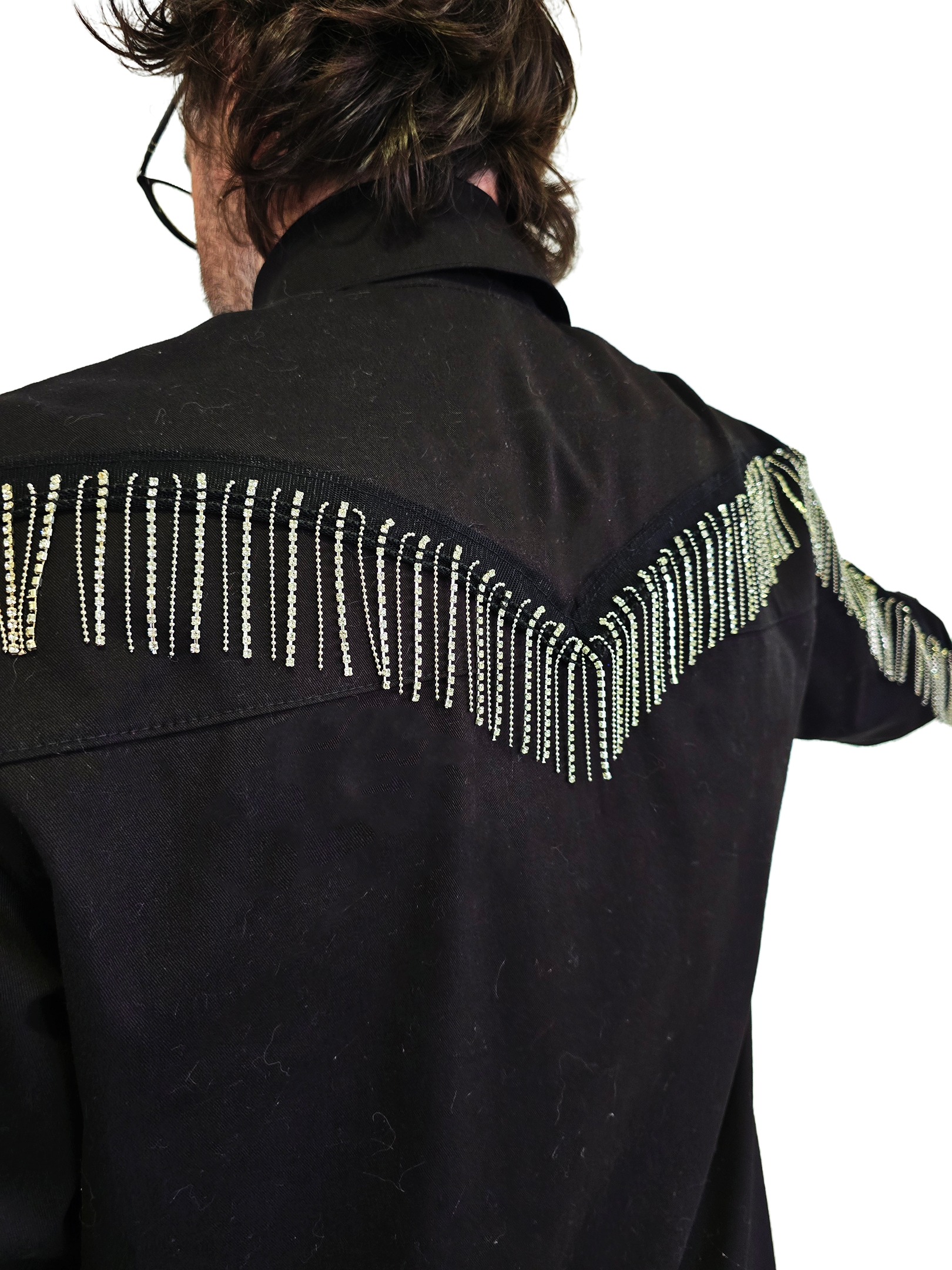 Camisa Franja Strass elegante e cheia de atitude, essa camisa traz um toque de brilho e movimento com franjas de pedrarias aplicadas no ombro e costas, criando um visual moderno e sofisticado. O corte clássico contrasta perfeitamente com detalhe glamouroso, tornando-a ideal para quem quer se destacar com estilo e personalidade. Perfeita para produções noturnas, eventos ou para dar um up fashion em qualquer look!