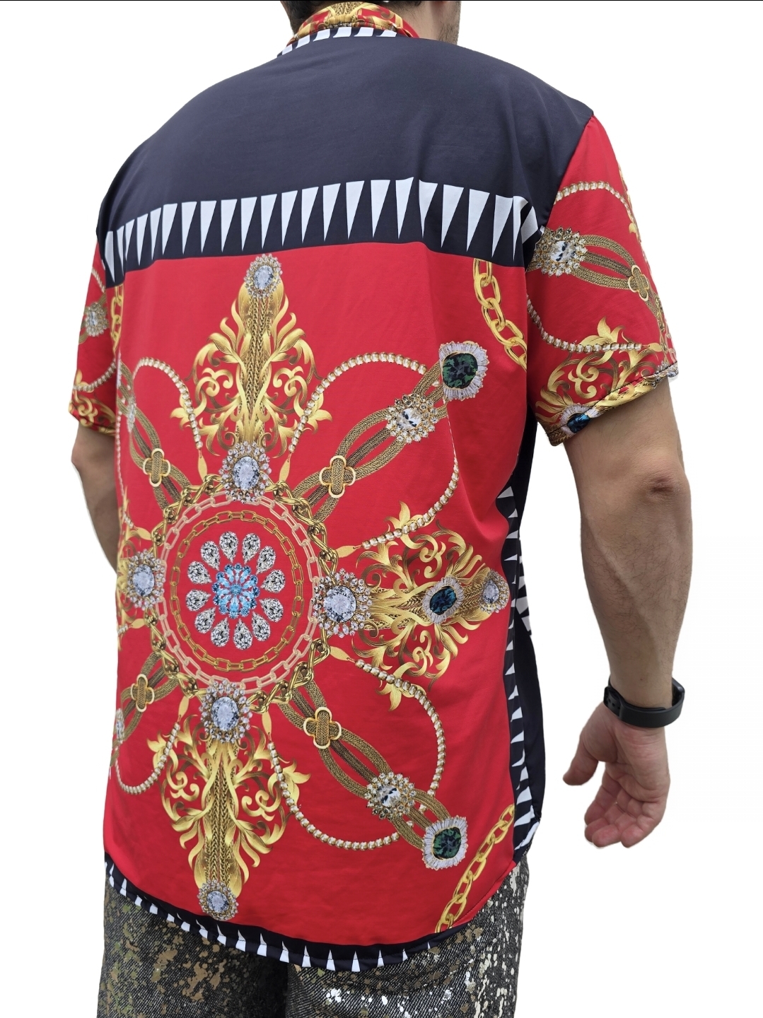 Camisa Rainha com manga curta com design marcante e estiloso. Possui estampa em vermelho vibrante com elementos clássicos em dourado, remetendo a corrente e ornamentos luxuosos. A parte superior traz contraste em preto com detalhes geométricos em branco, criando um visual moderno e diferenciado. Conta com fechamento por botões e gola tradicional, ideal para compor looks ousados e cheios de personalidade.
