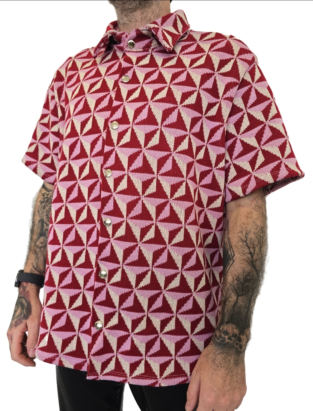 Camisa Tricot Amor manga curta com visual moderno e cheio de personalidade. Confeccionada em tecido leve e confortável, o modelo apresenta estampa geométrica em tons de vermelho e branco, trazendo um estilo marcante e comtemporâneo. Possui fechamento frontal por botões e gola tradicional, sendo ideal para composições casuais e despojadas. Perfeita para quem busca um look estiloso e diferenciado para o dia a dia ou momentos de lazer.