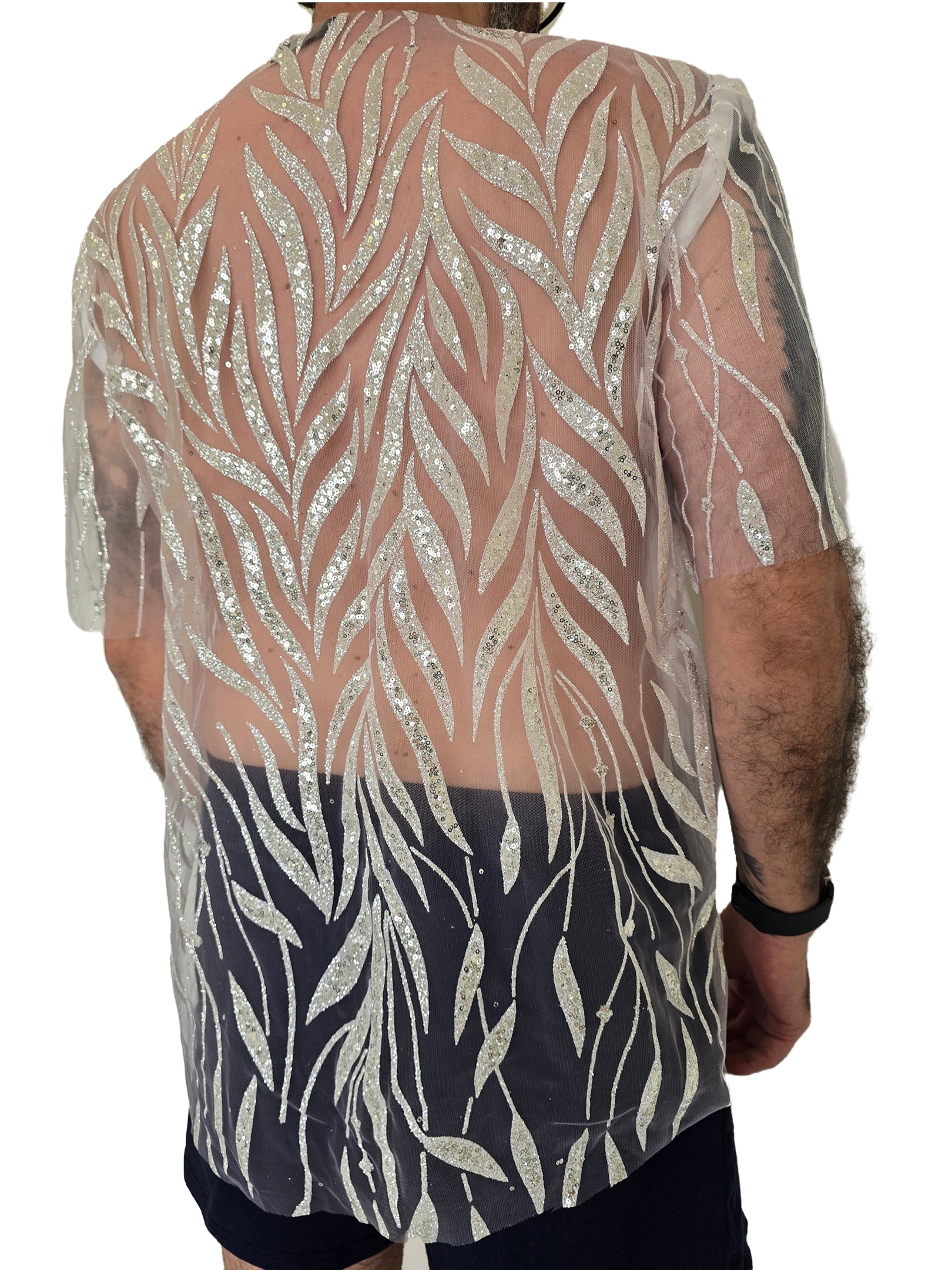 Camiseta Folhagem confeccionada em tule leve com aplicações de desenhos alongados que lembram folhas estilizadas. O tecido possui brilho sutil, trazendo um efeito moderno e sofisticado ao visual. Com caimento solto e confortável, a peça é ideal para compor looks ousados, frescos e cheios de personalidade. Perfeita para festas, eventos noturnos e produções fashionistas com destaque.