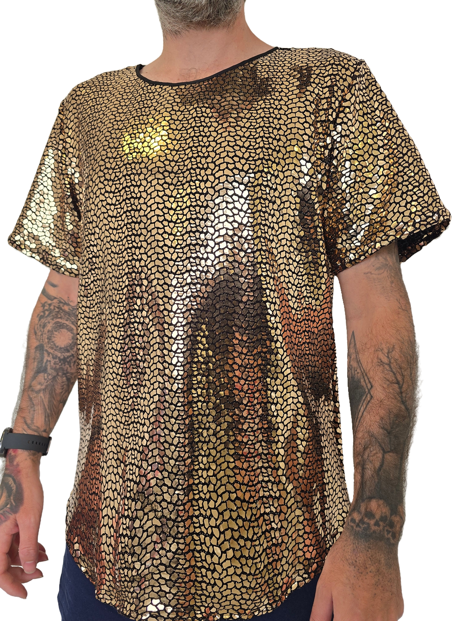 A Camiseta Lustre Dourada é a escolha perfeita para quem quer brilhar em qualquer ocasião. Produzida em um tecido metálico de alto impacto visual, ela apresenta um acabamento em pequenas escamas douradas que refletem a luz de forma intensa, criando um efeito luxuoso e sofisticado. Com modelagem oversized, a peça possui caimento solto, confortável e moderno. As mangas curtas mais amplas e a gola arredondada contribuem para um visual despojado, ideal para quem gosta de unir estilo e liberdade de movimento. O tecido leve proporciona conforto durante todo o uso, sem perder o brilho marcante.