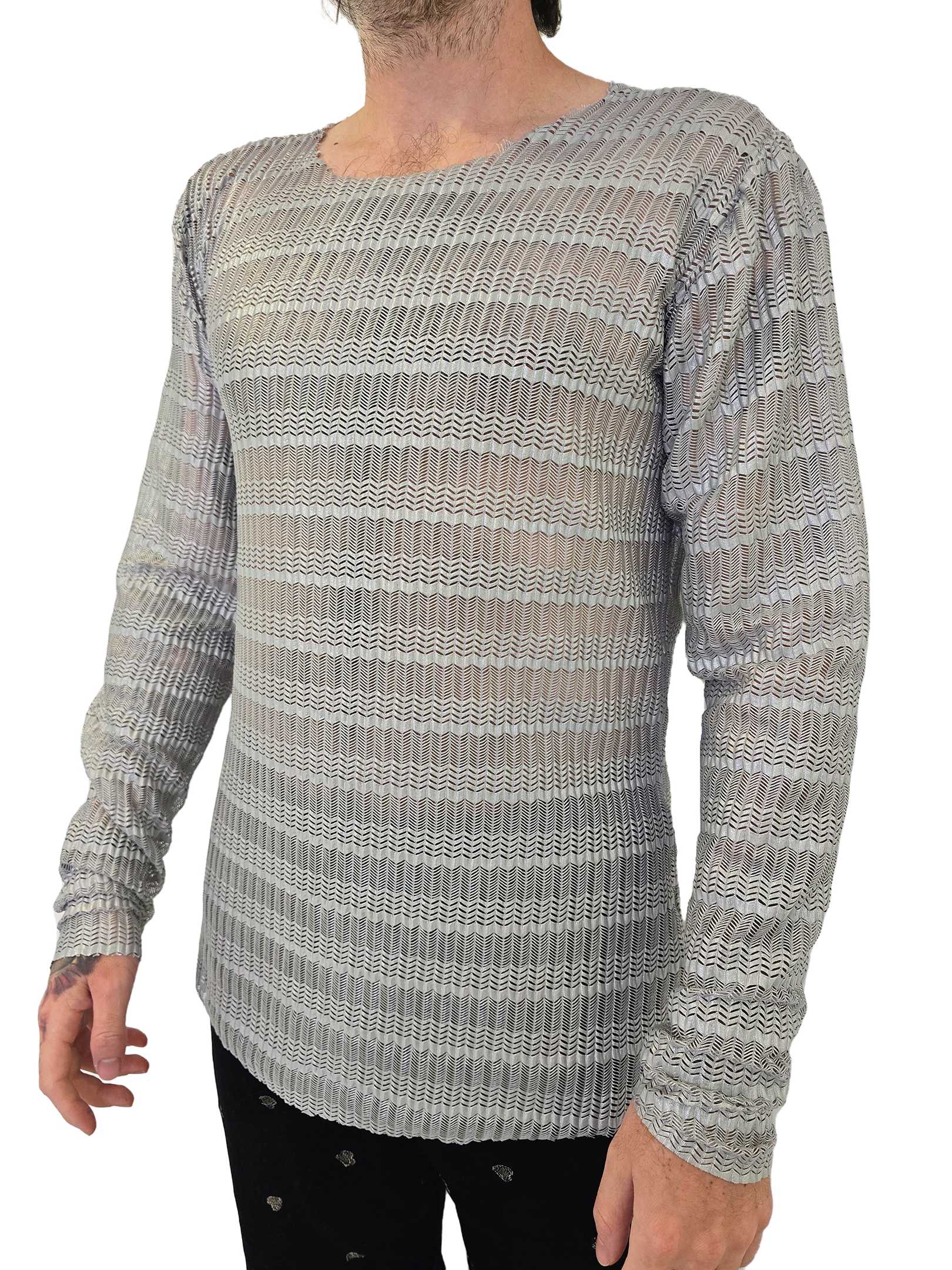 Camiseta Tricot Prata com trama vazada em listras horizontais que criam um visual moderno e despojado. Possui modelagem ajustada e mangas longas, ideal para composições casuais com um toque estiloso. O tecido leve e respirável garante conforto, sendo perfeita para dias frescos ou para sobrepor a peça básicas.