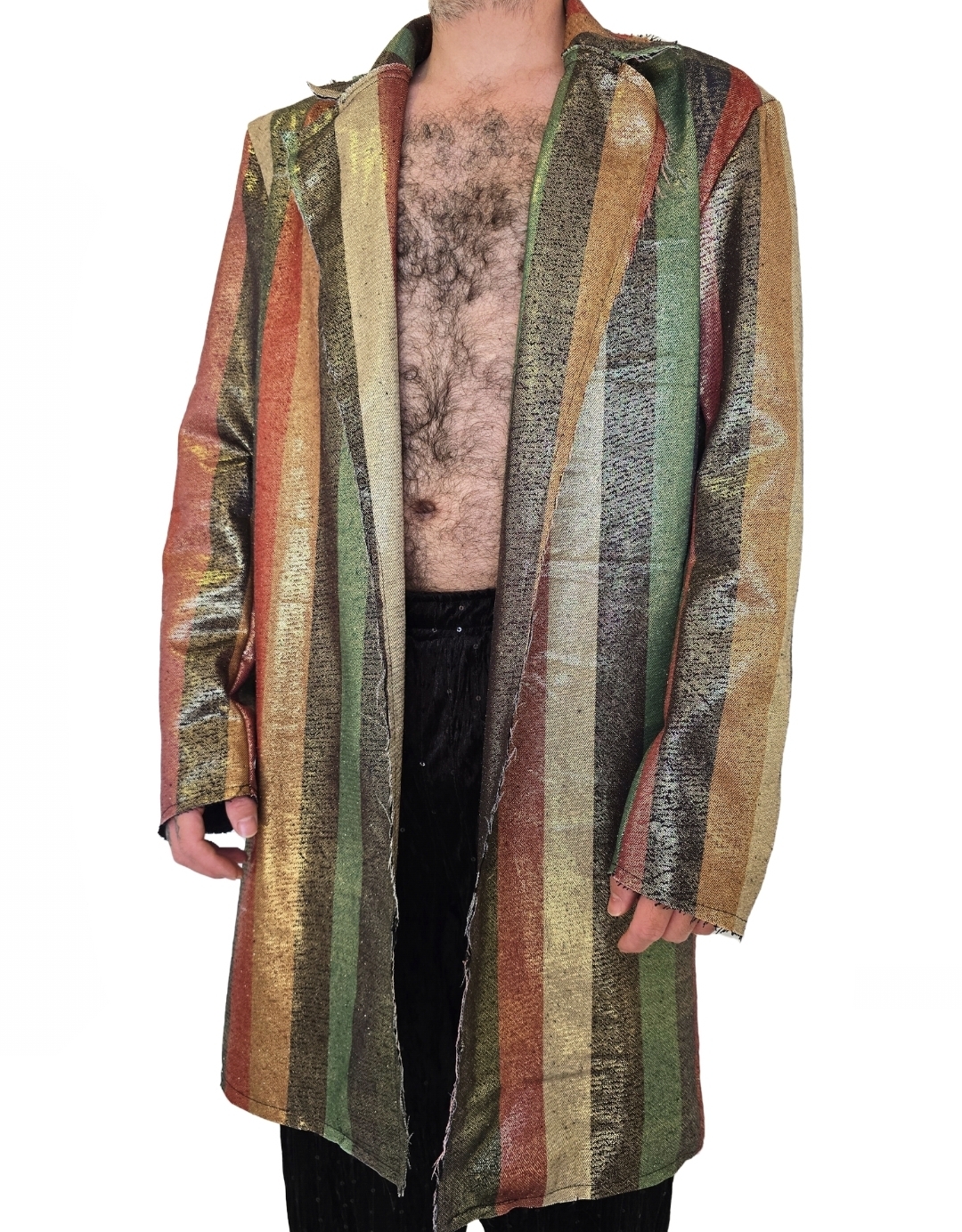 Casaco Lurex Arco que transforma qualquer visual básico em um espetáculo de moda. Com corte alongado e fluido é uma explosão de cor e brilho. Confeccionado em tecido de alta qualidade com listras verticais em degradê, ele reflete a luz a cada movimento com um acabamento metálico cintilante. Seu design aberto sem botões proporciona um caimento dramático e sofisticado. Perfeito para palcos, festivais ou para quem simplismente se recusa a ser discreta.