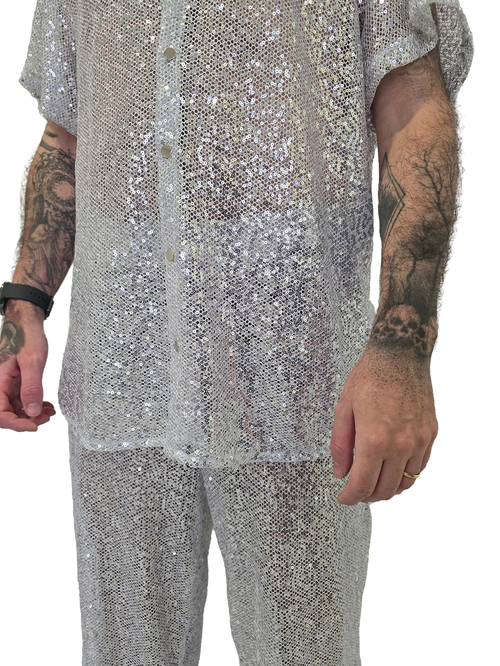 Conjunto Lunar ideal para festas e eventos temáticos. Acompanha camisa de manga curta com gola padre e fechamento frontal por botões, além de calça reta de caimento solto. O tecido leve e metalizado confere um visual moderno, ousado e cheio de estilo, perfeito ára quem quer se destacar com elegância e atitude.