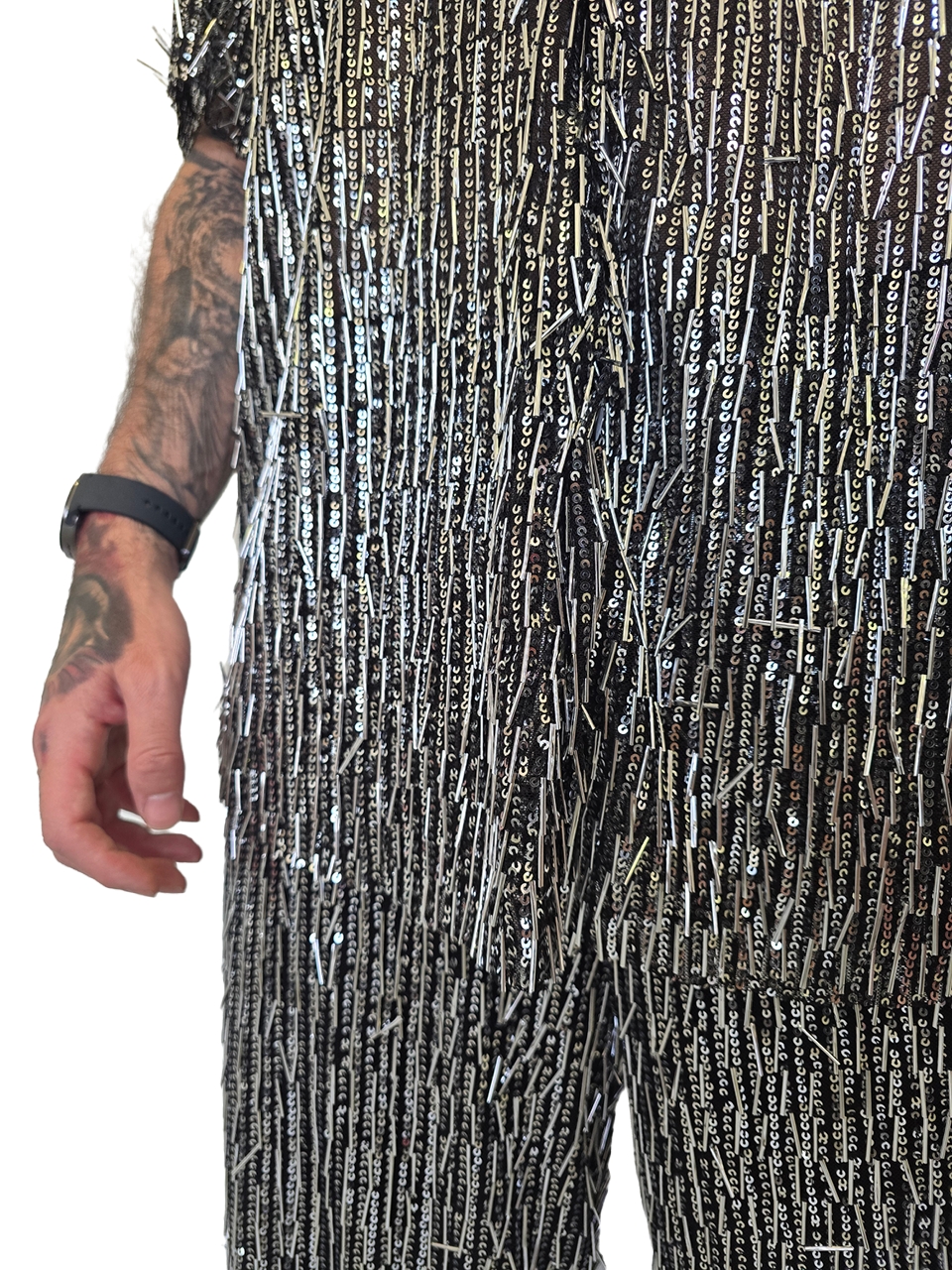 Conjunto Pastilha confeccionado em tecido de paetês prateados com aplicações de vidrilhos, que proporciona um visual moderno, ousado e cheio de brilho. A camisa possui gola clássica e fechamento por botões frontais, garantindo conforto e estilo. A calça tem caimento solto, com cintura elástica para melhor ajuste no corpo. Ideal para eventos noturnos, festas, shows ou produções fashionistas que pedem destaque. O tecido com textura rica e brilho metálico reflete a luz de forma intensa, tornando o look impactante e sofisticado.