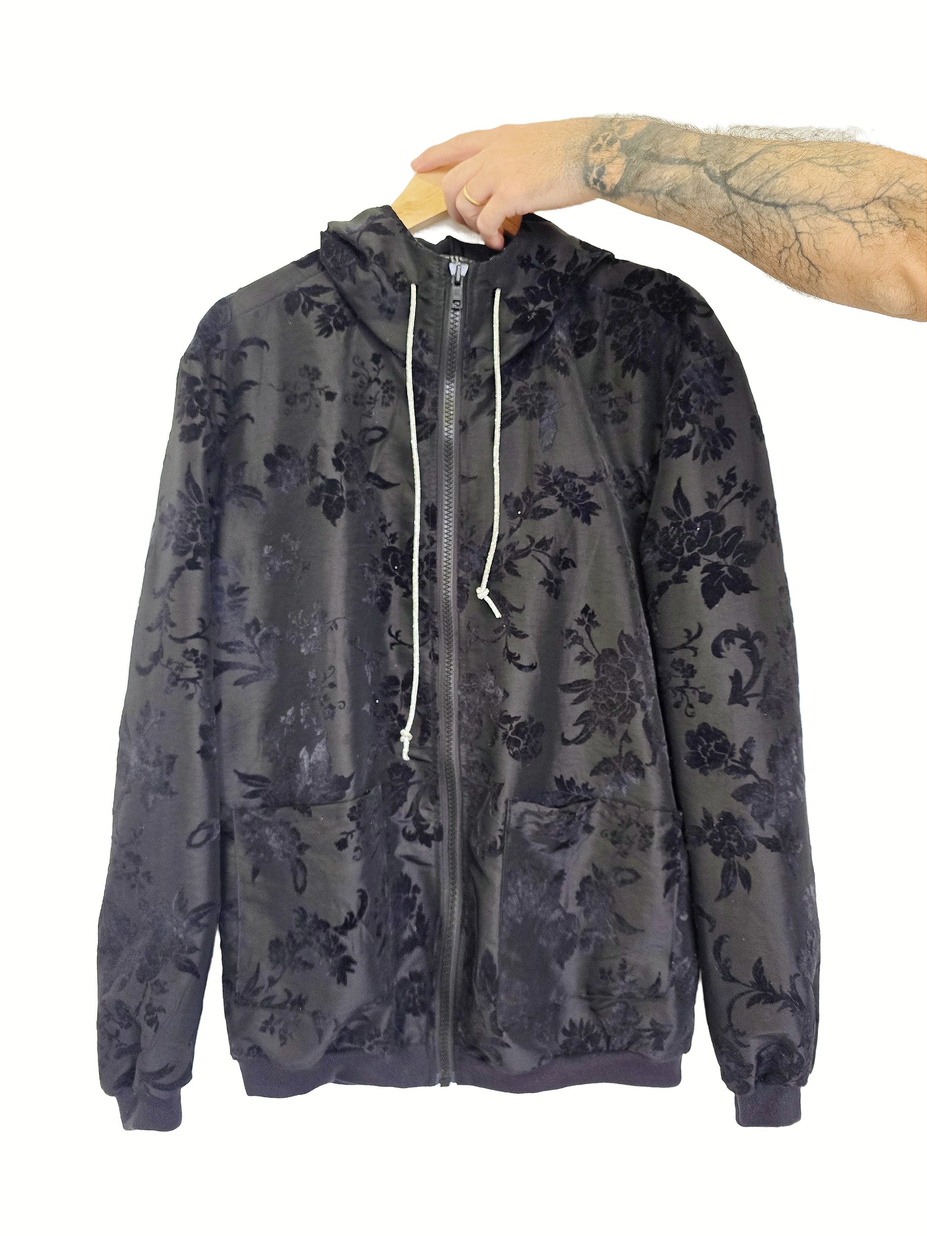 Jaqueta Capuz Flores Aveludadas em tecido confortável, ideal para compor looks modernos e versáteis. Possui estampa floral em veludo, que traz personalidade e sofisticação sem perder a neutralidade. Modelagem clássica com fechamento frontal em zíper, capuz ajustável com cordão e punhos em ribana, garantindo melhor ajuste ao corpo. Perfeita para o dia a dia ou produções mais urbanas.