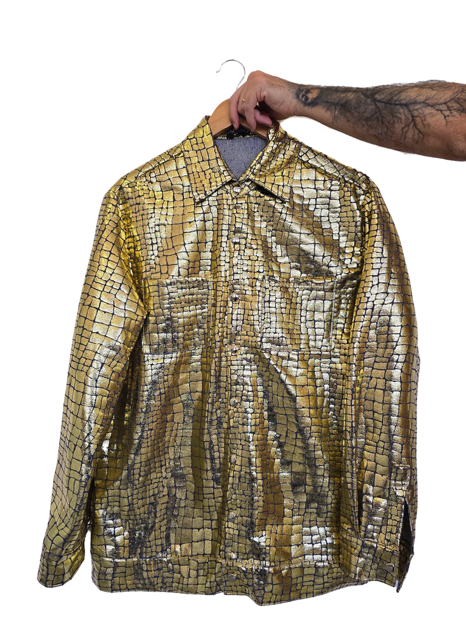 Feita para quem gosta de brilhar e não passar despercebido! Com estampa que imita textura de crocodilo e acabamento metalizado, essa peça é puro destaque. Possui gola clássica, fechamento por botões e caimento confortável que equilibra estilo e atitude.