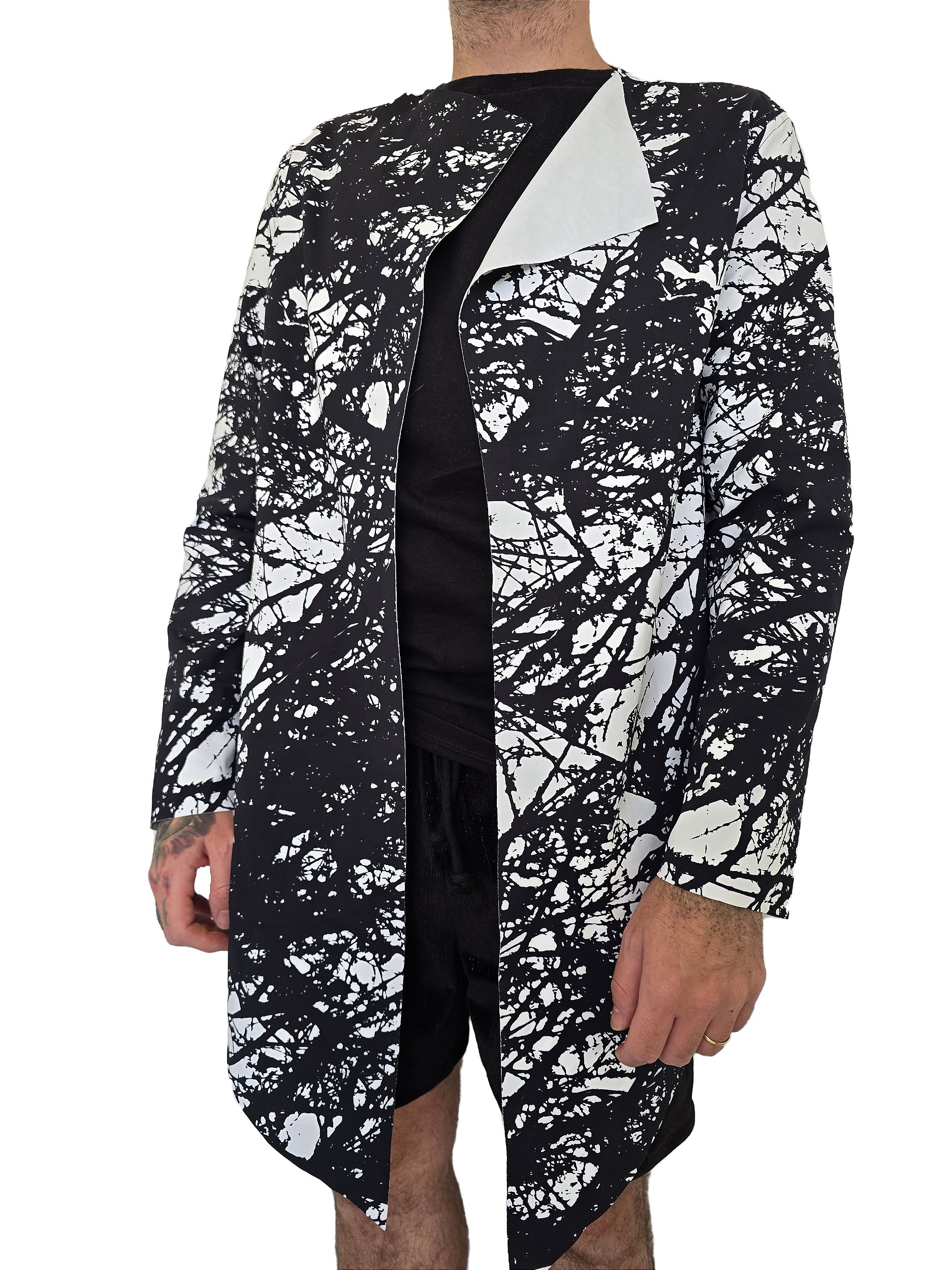 Jaqueta Galhos com modelagem reta e caimento leve, perfeito para compor looks modernos e elegantes. A peça apresenta estampa abstrata em preto e branco, criando um visual marcante e sofisticado. Possui mangas longas e abertura frontal sem fechamento, ideal para sobreposição com diferentes estilos. Versátil, combina facilmente com peças básicas, trazendo um toque de personalidade ao look.