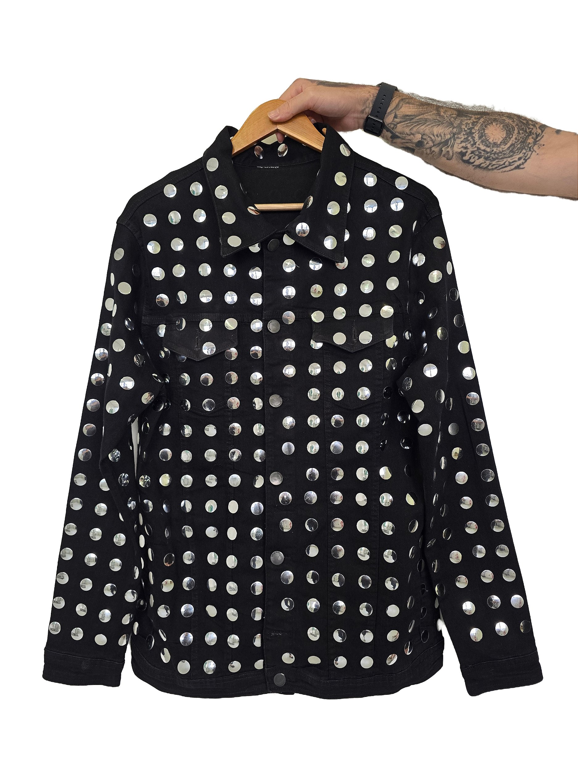 Jaqueta Globo Shine com design moderno e marcante, toda aplicada com tachas metálicas redondas prateadas que criam um efeito brilhante e sofisticado. Modelo estruturado, com gola tradicional, fechamento frontal por botões frontais. Confeccionada em tecido encorpado, proporciona caimento firme e estiloso. Peça Perfeita para compor looks ousados e fashionistas, ideal para quem ama um visual impactante com toque urbano e glam rock.
