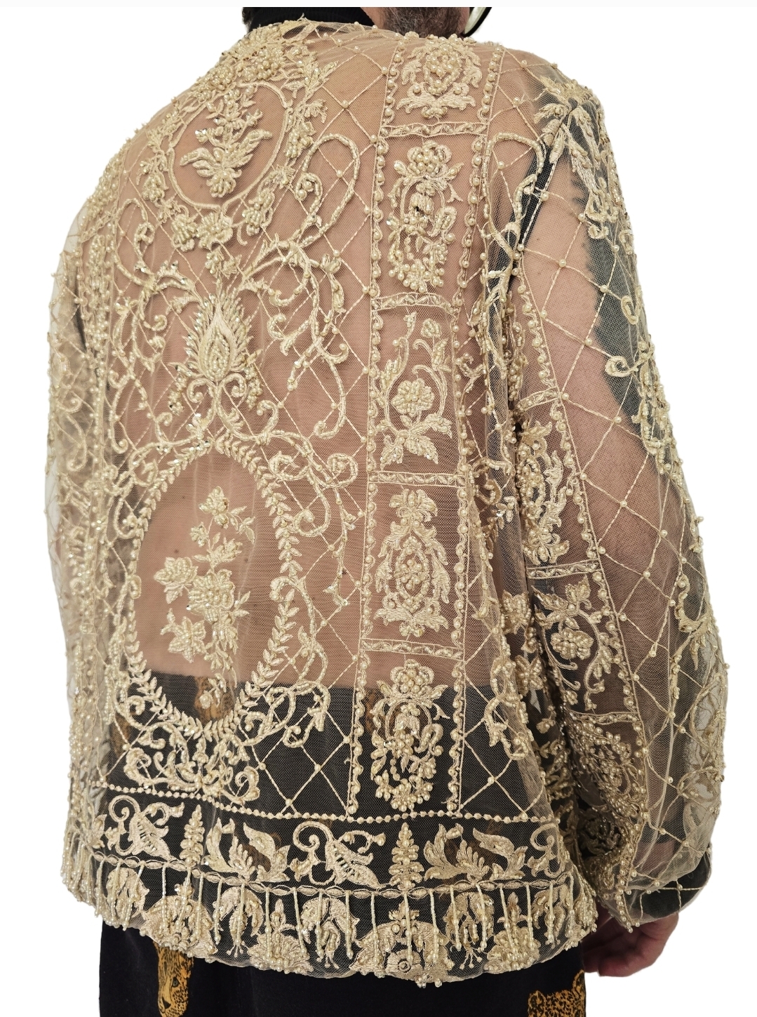 Jaqueta Melada confeccionada em tule bordado com ricos arabescos dourados, trazendo um visual sofisticado e artístico. O modelo possui transparência elegante, mangas amplas e detalhe na gola, punhos e fechamento frontal em zíper, criando um contraste moderno e luxuoso. Os bordados elaborados e o brilho sutil do tecido transforma a peça em um verdadeiro destaque no look, perfeita para produções ousadas, eventos, festas ou composições de alta moda. Uma jaqueta única que une elegância, personalidade e estilo.