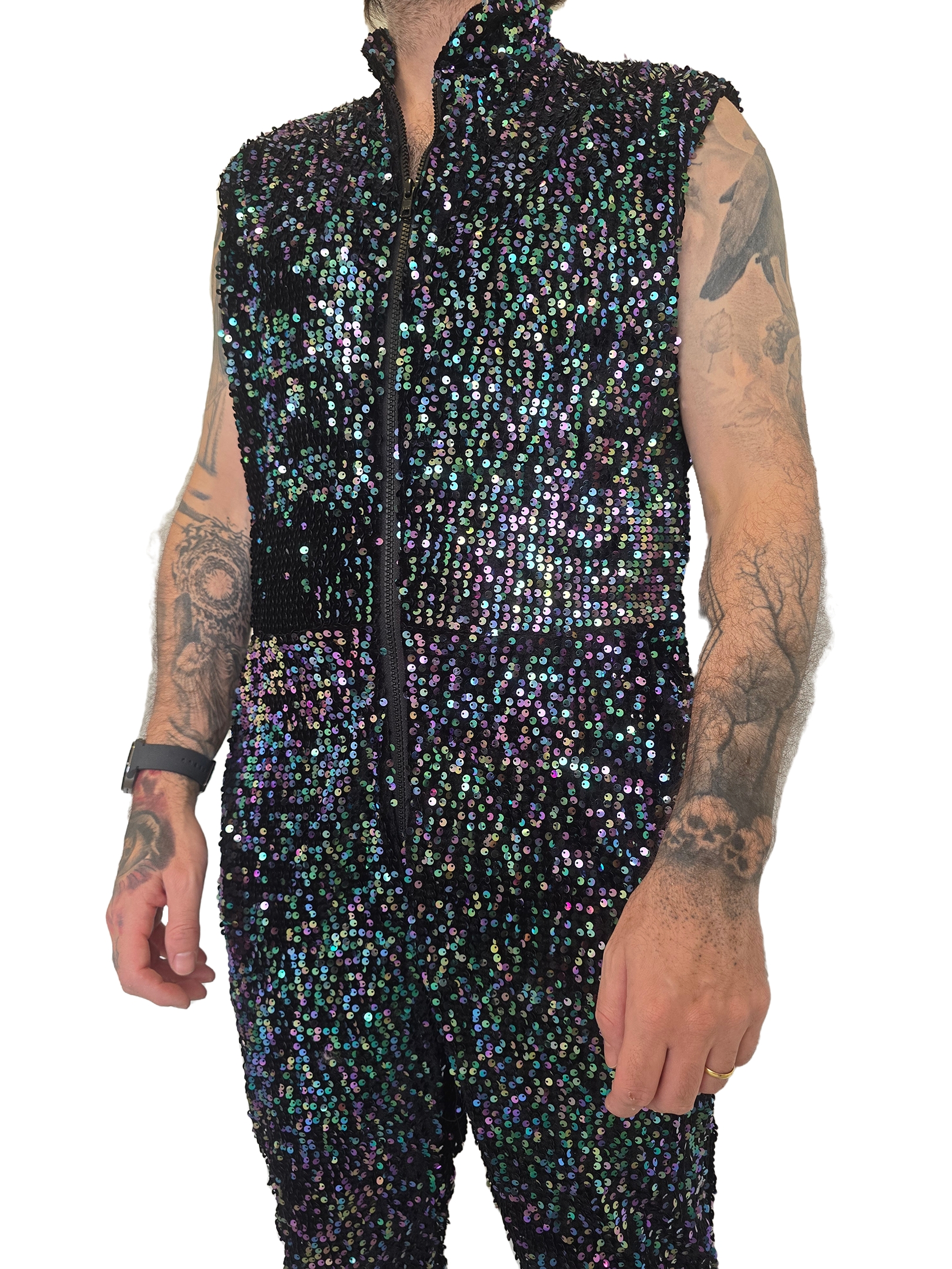 Macacão Confete Esverdeado coberto por paetês brilhantes, criando um efeito reluzente e glamouroso. Transmite uma vibe moderna, ousada e sofisticada, ideal para eventos noturnos, festas ou apresentações com estilo marcante e cheio de atitude.