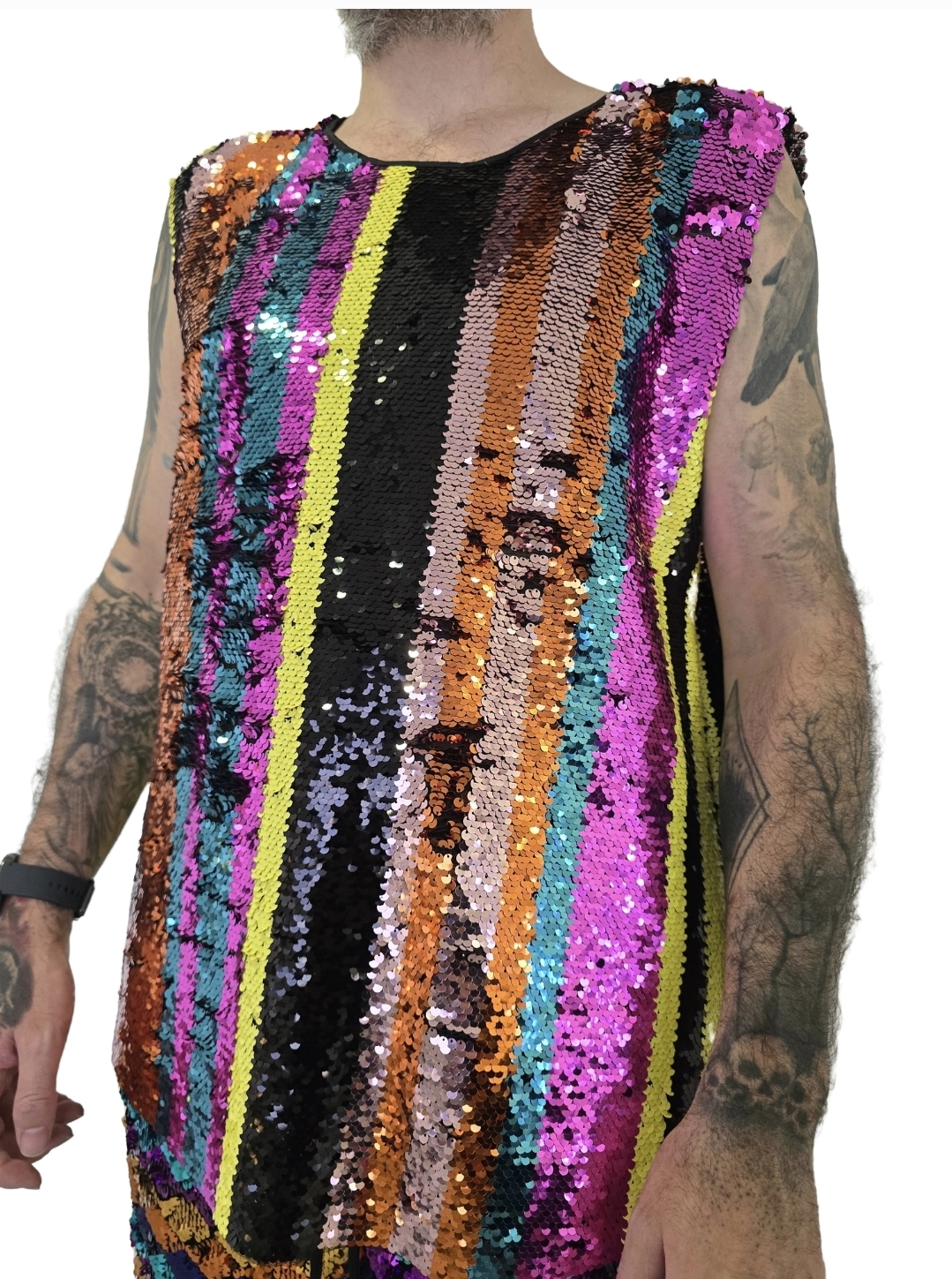 Regata Perfeita para qem gosta de ousar com estilo. Confeccionada em paetê de alto brilho, ela traz listras verticais multicoloridas que refletem luz e personalidade em cada detalhe. Moderna, vibrante e cheia de atitude, é a peça ideal para composições impactantes. Com modelagem confortável e caimento leve, valoriza o visual sem perder liberdade de movimento. Ideal para usar sozinha ou em conjunto com a bermuda no mesmo tecido, criando um look poderoso e nada óbvio.